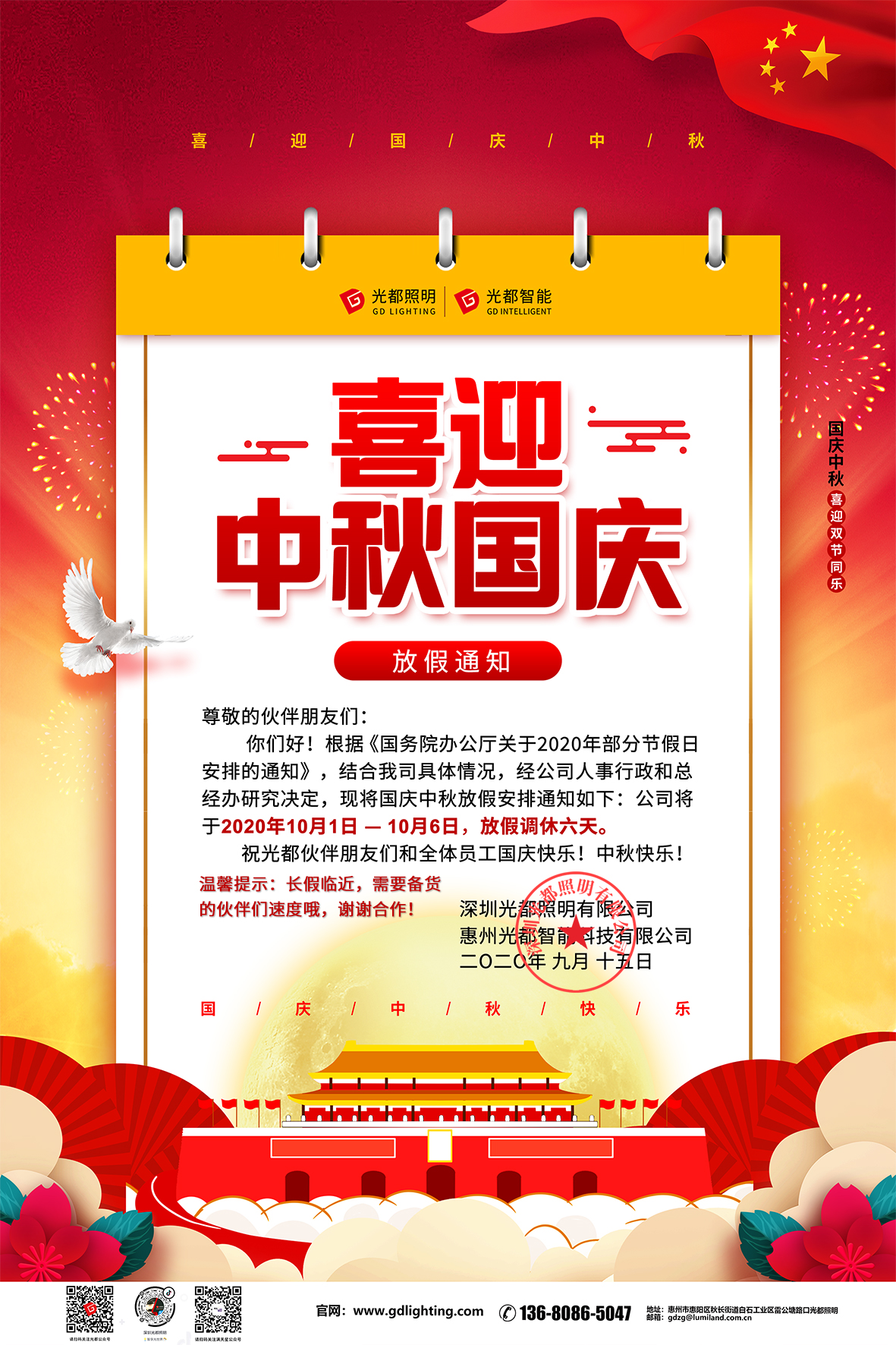 溫馨提示:光都中秋國慶放假時間為10月1-6日,2020愛您們哦~!萬家團圓迎中秋,四海歡騰慶國慶!值此雙節來臨之際,光都全體員工恭祝伙伴朋友們中秋快樂,闔家幸福!喜迎共和國71周年華誕,祝愿偉大祖國神州大地花似錦,國強民盛家繁榮,祖國母親生日快樂,光都人與您同在!