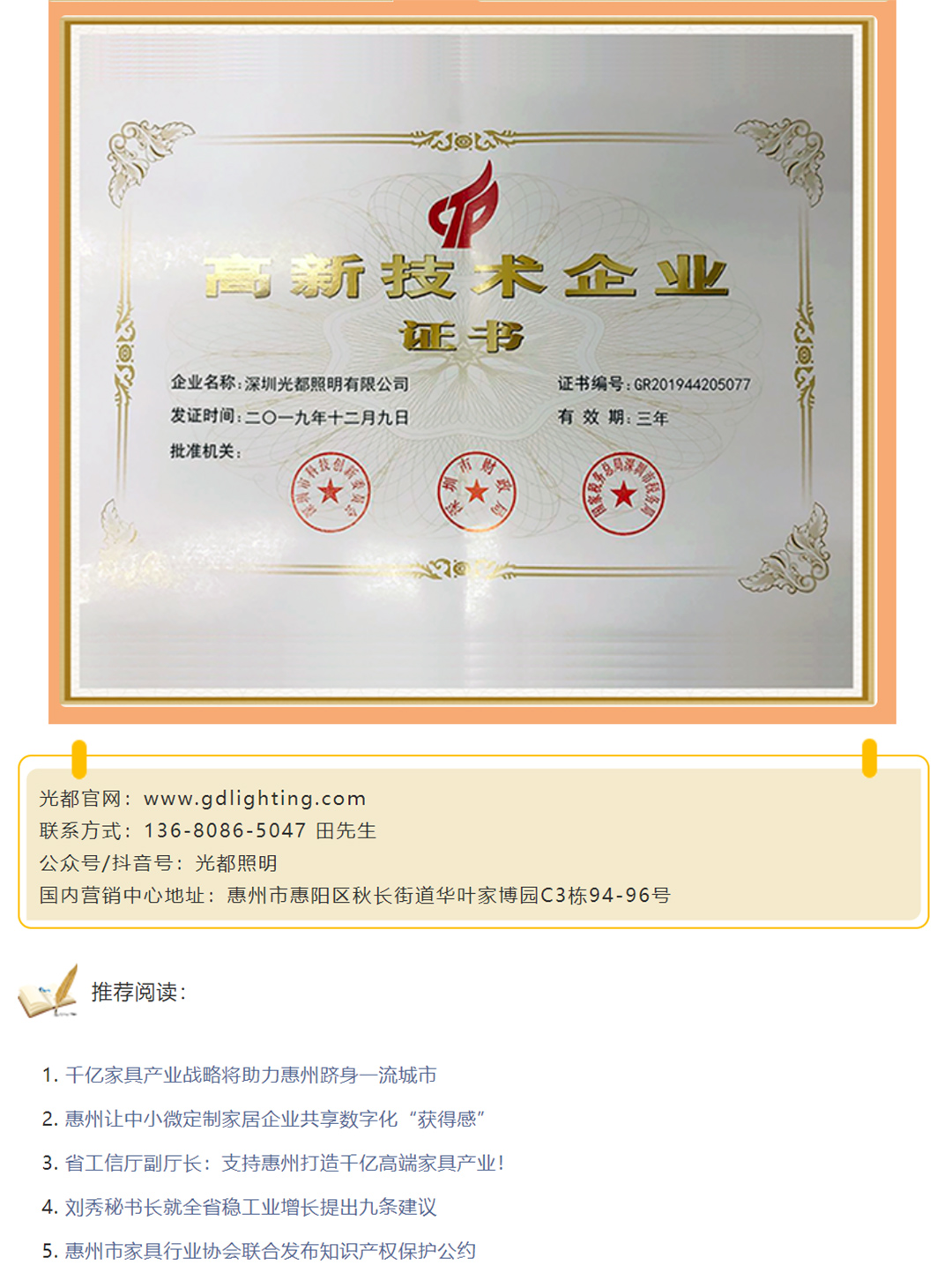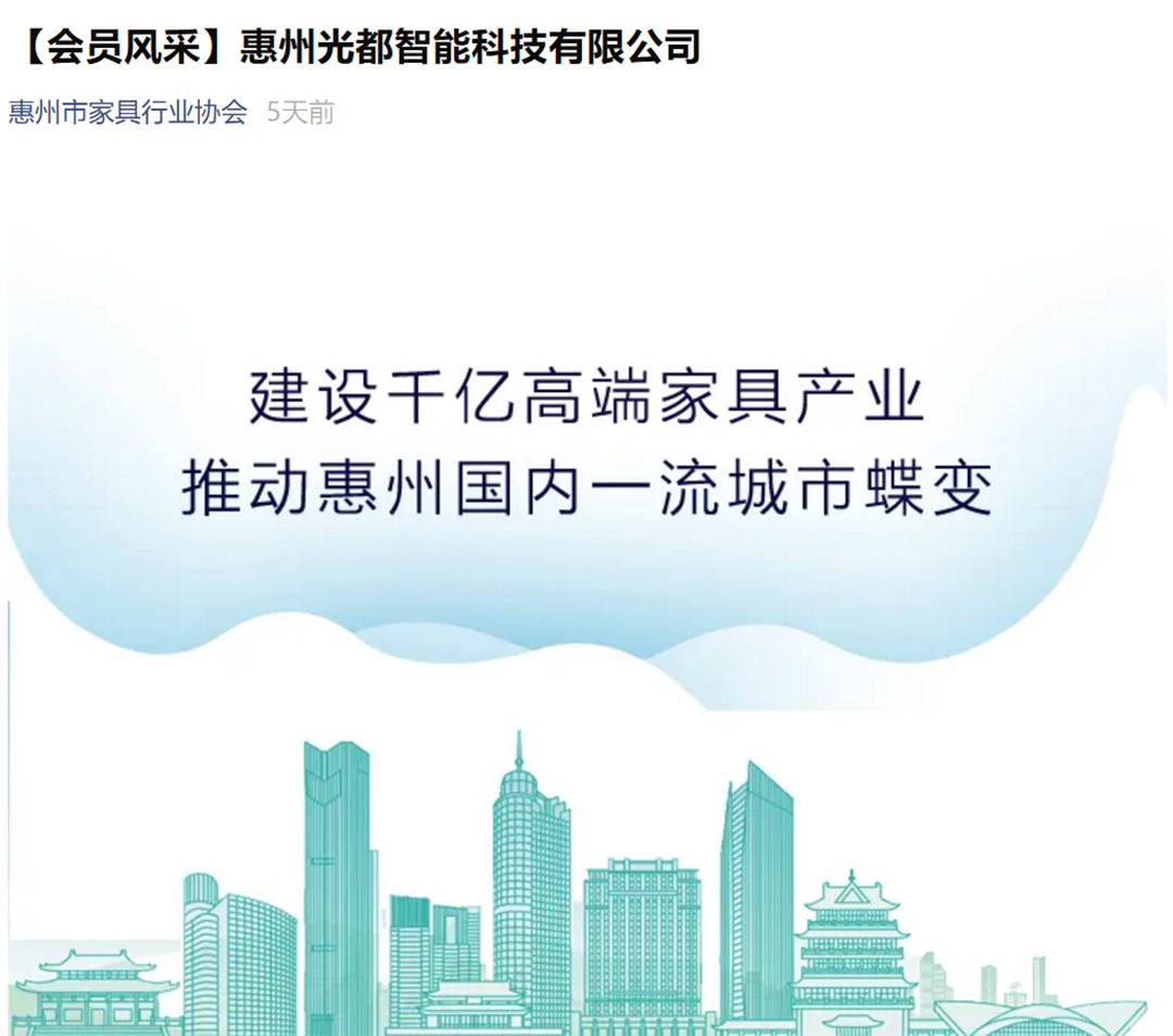 【光都簡介】深圳光都照明有限公司系全球局部照明定制方案和服務提供商,國家高新技術企業,智能健康照明領航者,拎包、整裝和全屋定制燈光專家。惠州光都智能科技有限公司是光都照明在惠州的生產基地,專注家具照明16年,擁有LED局部照明全產業鏈,主要從事LED燈具、驅動電源、感應開關、紫外線殺菌燈和智能配件的研發和生產,產品暢銷全球60多個國家和地區,擁有200多項專利和1000多份各類資質證書,通過ISO9001:2015質量管理體系認證,為惠州市家具行業協會專業定制委員會副會長單位。