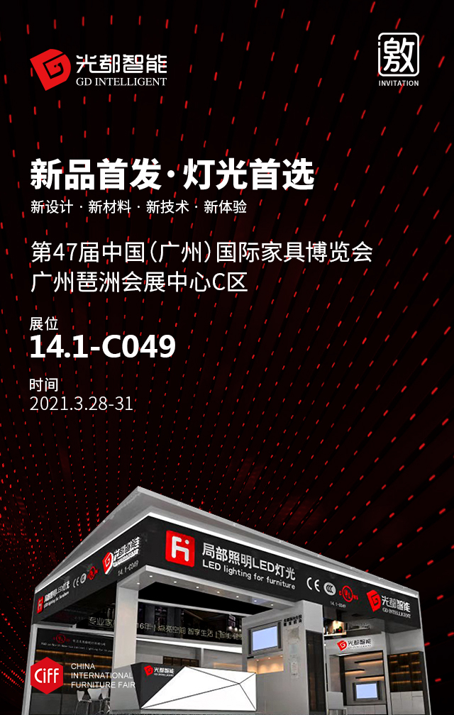溫馨提示:第47屆中國(廣州)國際家具博覽會暨家具生產設備及輔料展,光都照明&光都智能攜2021系列新品,多項專利產品,88平全新展館如約開啟!新品首發,燈光首選!新設計 · 新材料 · 新技術 · 新體驗,全球定制 · 整裝 · 工程燈光解決方案及服務提供商。光都專注家具照明16年,中國局部照明先驅,智能健康照明領航者;國家高新技術企業,高定俱樂部成員,惠州家具協會專業定制委會員副會長單位。2021/3/28-31廣州琶洲 · 廣交會展館C區14.1-C049光都照明&光都智能盛世綻放,向新而生!驚喜多多,福利多多,光都誠邀您蒞臨品鑒,觀摩指導!3月底廣州春光明媚,精彩紛呈,不見不散!